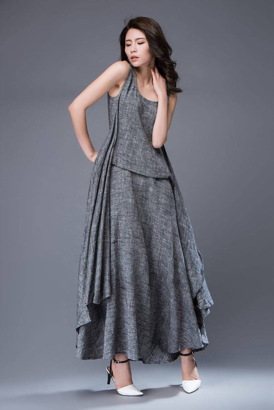 Gray Linen Dress - Layered Flowing Elegant Long Sleeve Long Summer Dress with Scoop Neck Handmade Clothing C881
