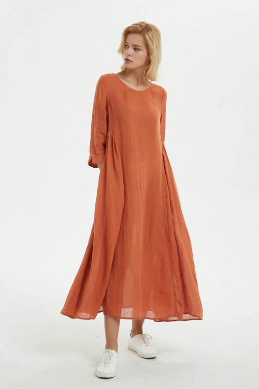 orange dress for summer - women dress with pockets- loose & casual dress, midi sleeve dress - maxi linen dress, gift for her C1276