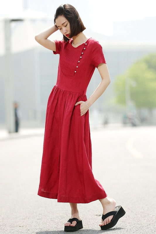 Dress, red dress, linen dress, casual dress, summer dress, maxi dress, long dress, womens dresses, pleated dress, dress pockets C345