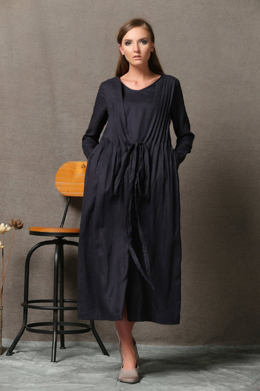 Black Dress, pleated dress, long linen dress, causal dress, linen dress, summer dress, long sleeve dress, maxi dress, loose dress C557