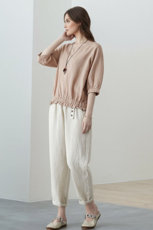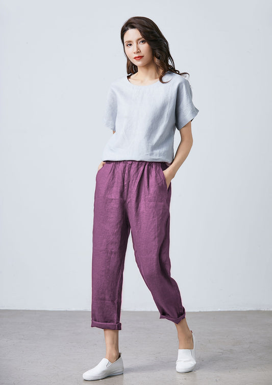Linen Cropped Pants: Tapered Loose Fit with Elastic Waist, Ylistyle C5325
