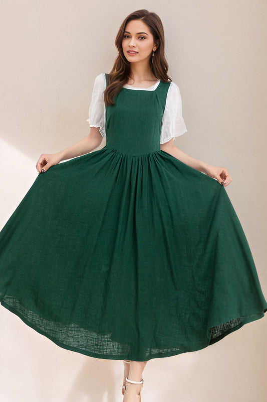 Womens dark green Linen midi Cottagecore Dress c5332