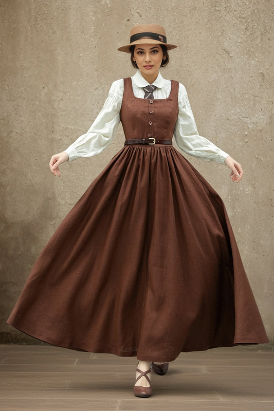 Brown linen Pinafore Maxi Dress C5363