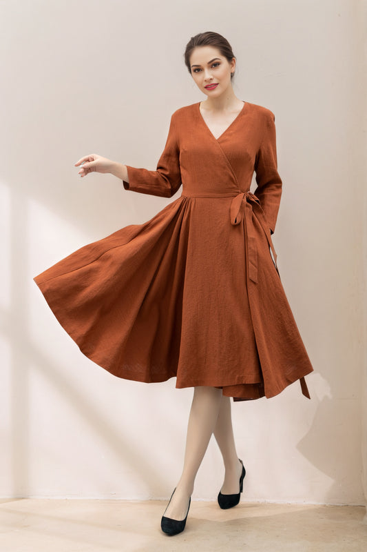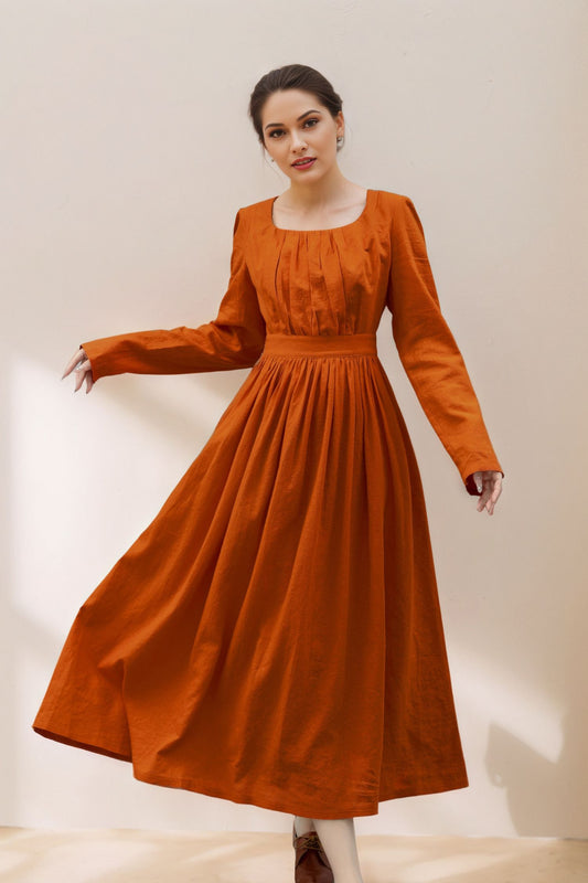 Long Sleeve Orange Linen Dress for Women C5364