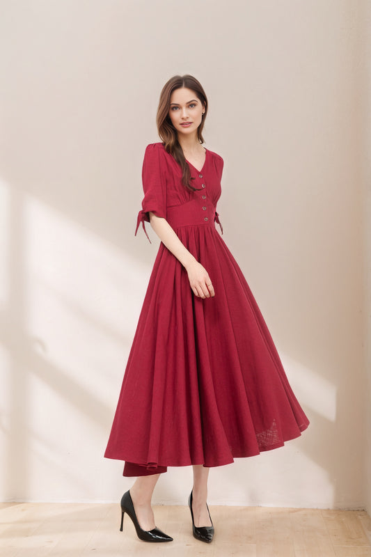 Burgundy fit and flare linen dress C5368