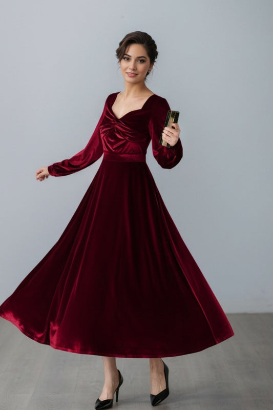 Elegant Burgundy Velvet Long Dress C5357