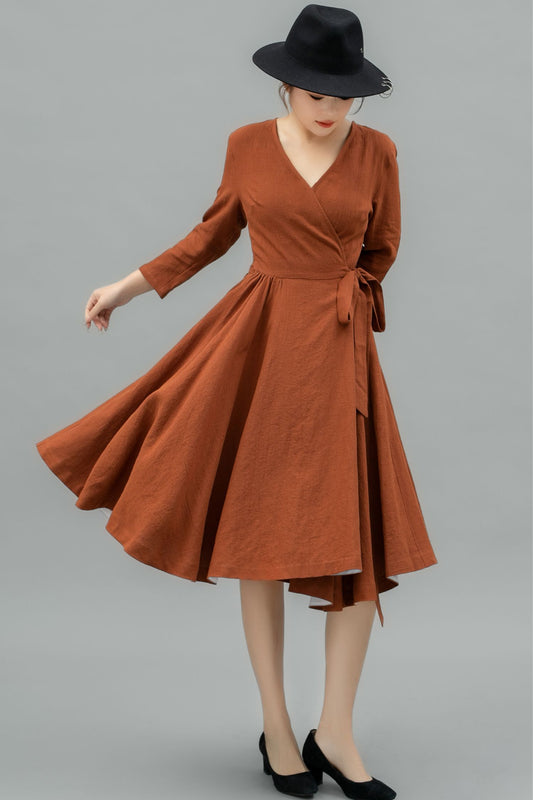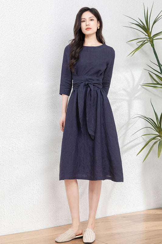 V-Neck Swing Midi linen dress with Waist Tie C4741 - CK2500015