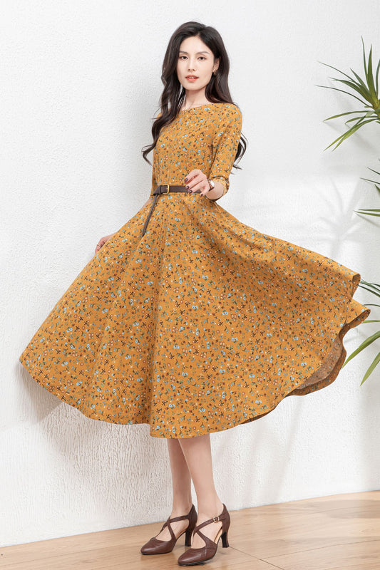 Vintage Inspired Floral Linen Midi Dress C4745 - CK2500008