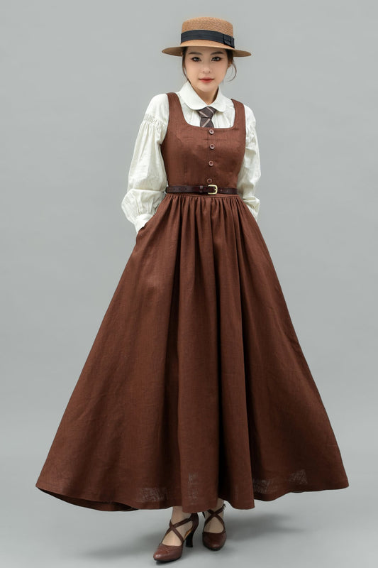 Brown linen Pinafore Maxi Dress C4746 - CK2500011