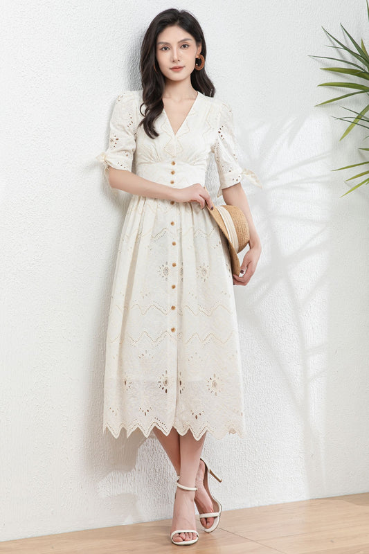 Cream White Embroidered Cotton Midi Dress c4980 - ab04493