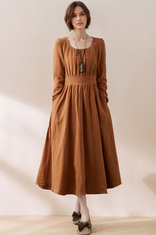 fit and flare Pleated Linen Dress, High Waist Linen maxi Dress with Tie Bow C5385