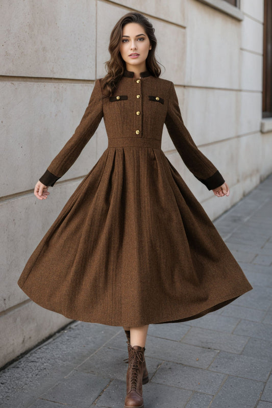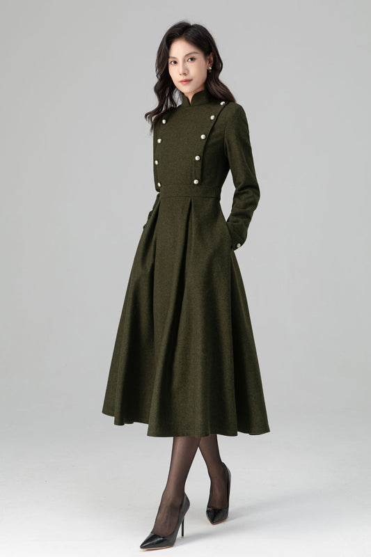 Warm Winter Military Button front Wool Dress Women C5194