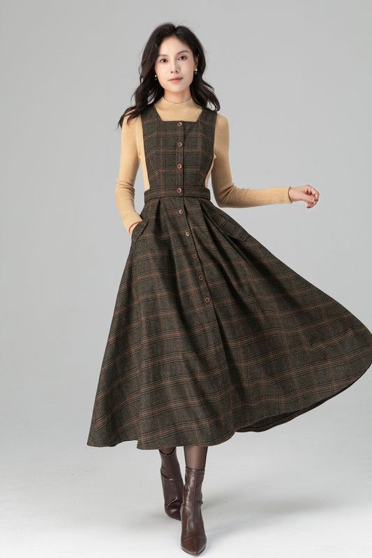 Classic Plaid A Line Apron Midi Wool Dress C5196