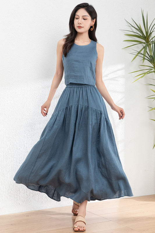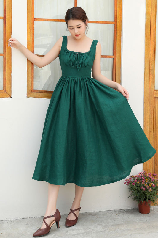 Flattering High-Waisted Green Linen Pinafore Dress c4838