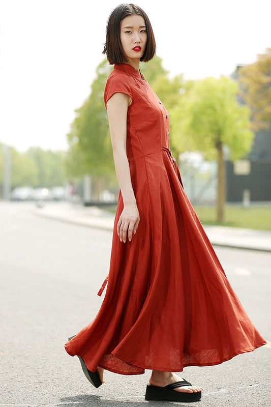 Midi Linen Casual Pink Swing Loose Fit Dress C2247