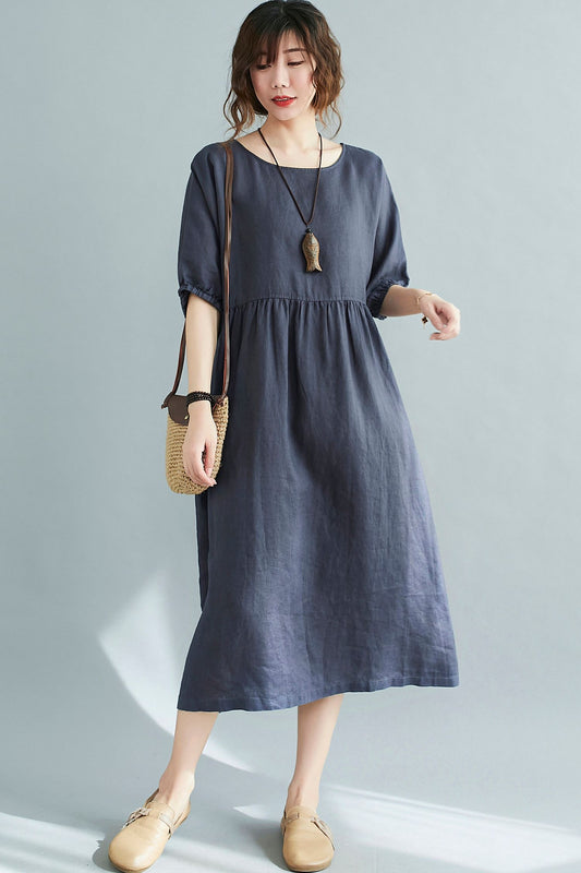 Natural Half Sleeve Linen Midi Dress in Navy C2113