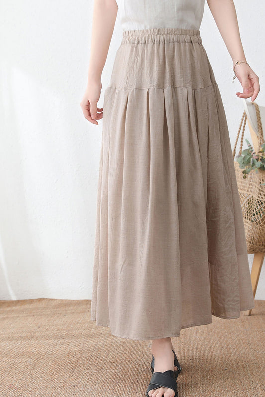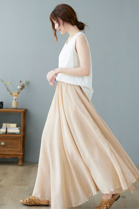 Beige Cotton linen maxi Summer swing A Line pleated skirt C2335