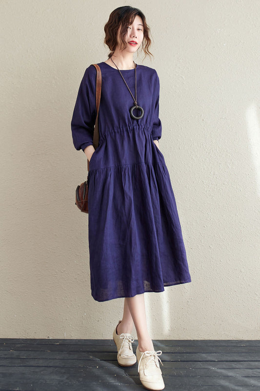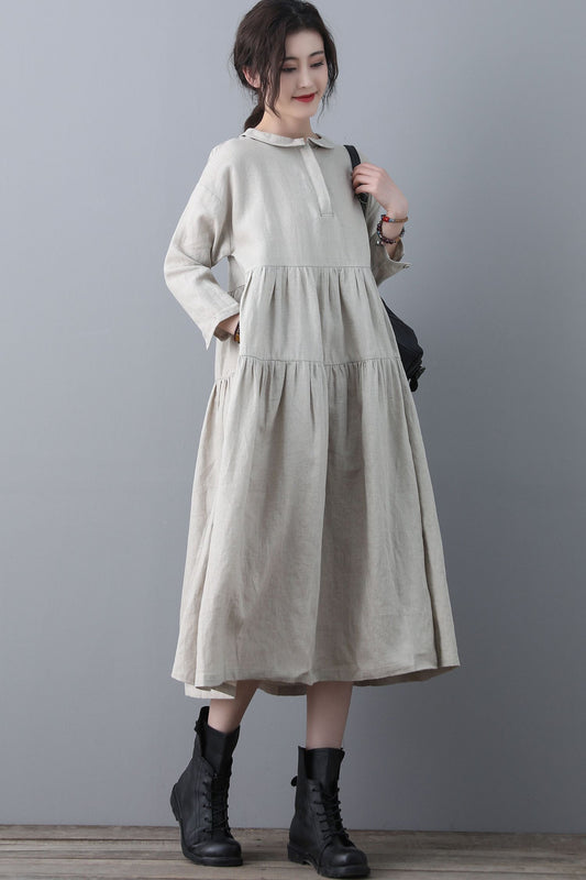 Loose Linen Midi Oversized Long Sleeve A line Dress with Pocket C1848