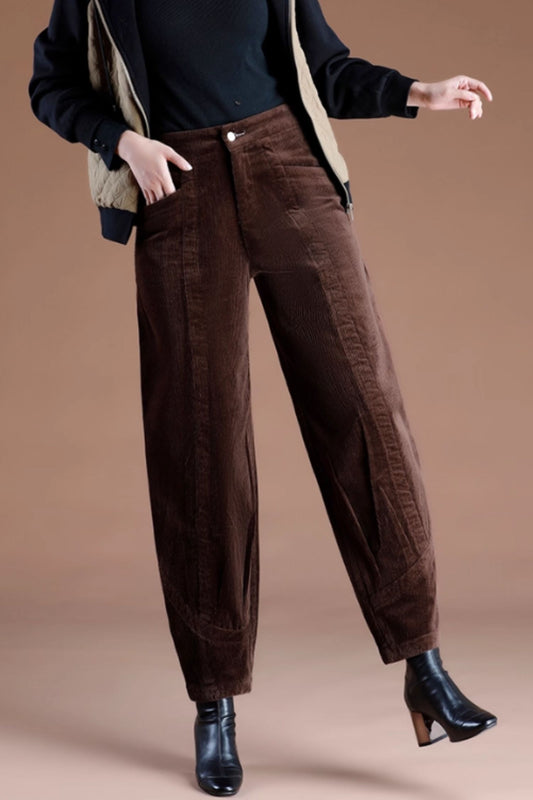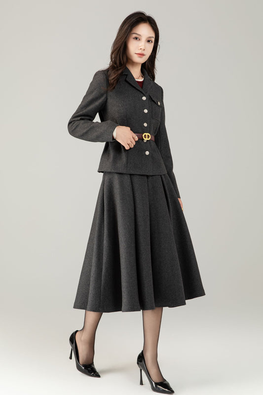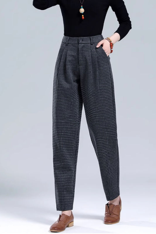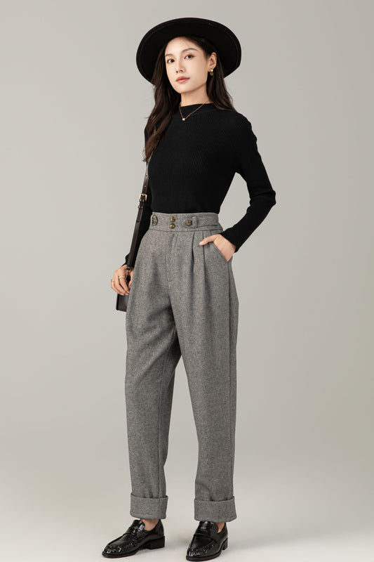 High-Waist Wool Trousers: Vintage Grey Pleated Cuffed Pants C5247