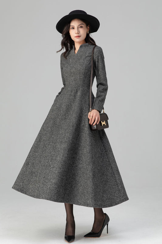 Warm Grey Long Sleeves Wool Maxi Dress C5204