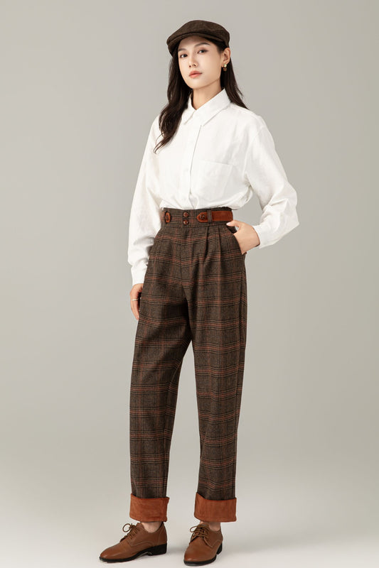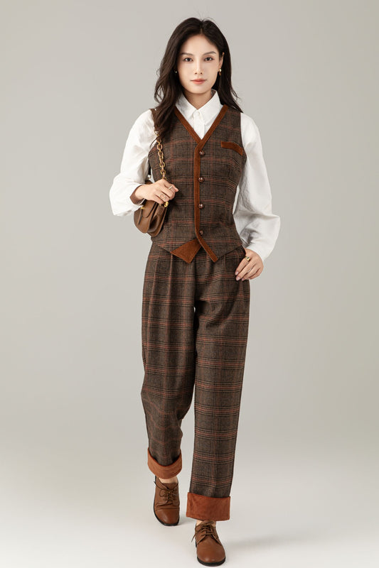 Brown Plaid Wool Suit Set, Wool vest and Wool pants C5248