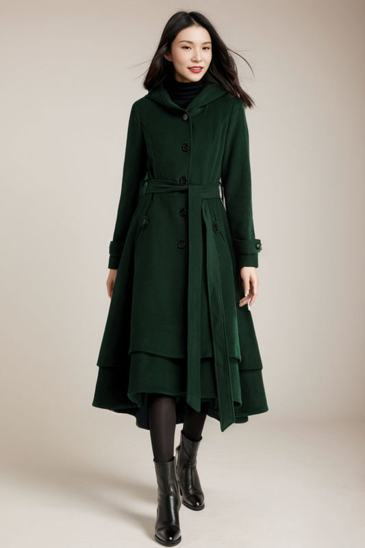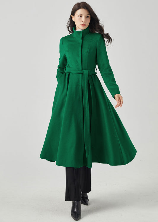 Green Wool Coat, Fit and Flare Coat, Long Wool Coat C3563