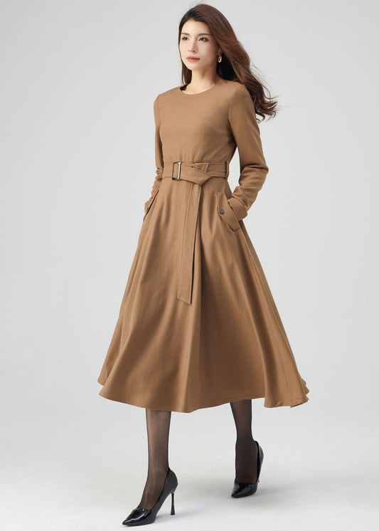 Midi Wool Dress, Belted Dress, Fit and Flare Dress C3543