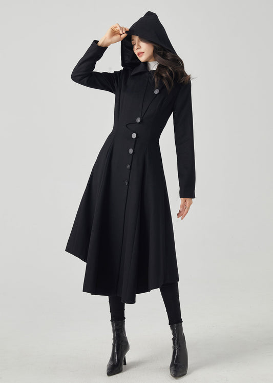 Black Wool Coat, Long Wool Coat, Hooded Wool Coat C3562
