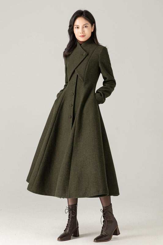 Olive Green Wool Blend Swing Maxi Coat: Vintage Style Winter Overcoat, Ylistyle C5373