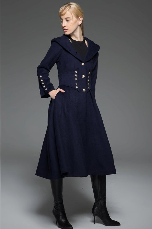Navy Military Style Coat - Long Modern Dark Blue Hooded Winter Wool Designer Coat with Pockets and Button Detail C739