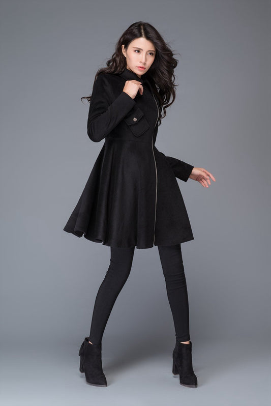 black coat, Asymmetric coat, winter coat, wool coat, zipper coat, women jackets, womens coats, custom coat, fit and flare coat C990