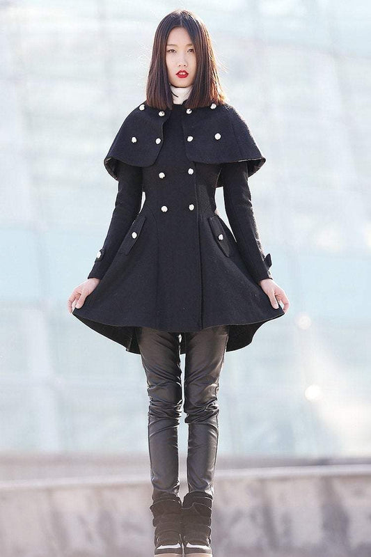 Black Wool Cape Asymmetrical Coat Wth Double Breasted C187