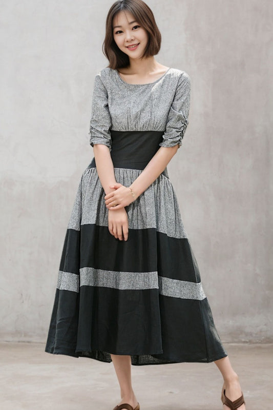 Black grey stripey Loose Fit Linen Dress c4683