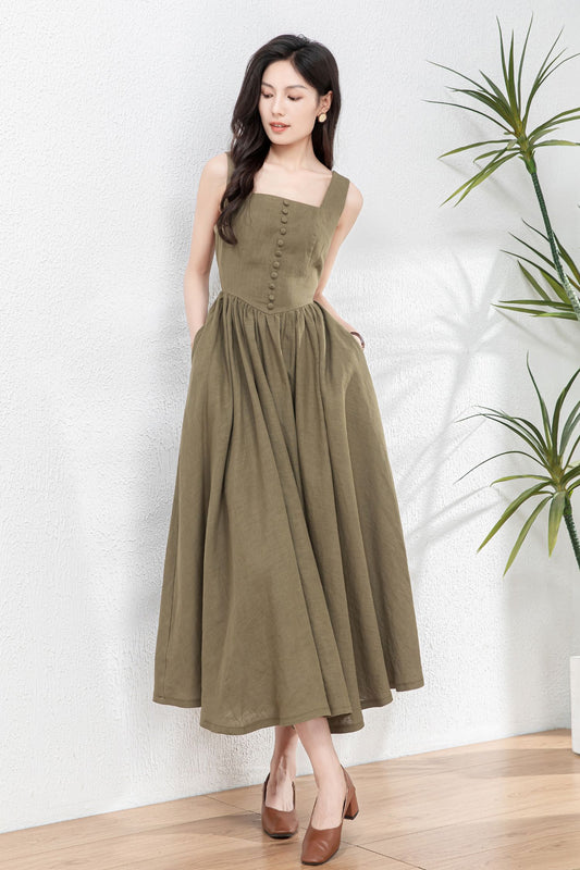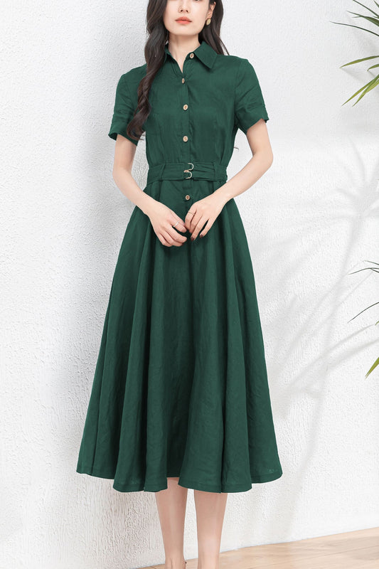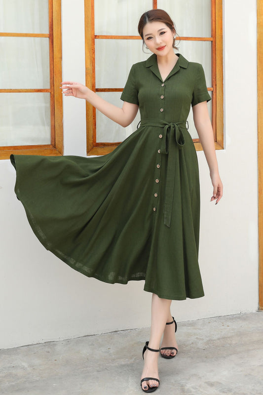 Dark Green Midi Linen Dress c4899