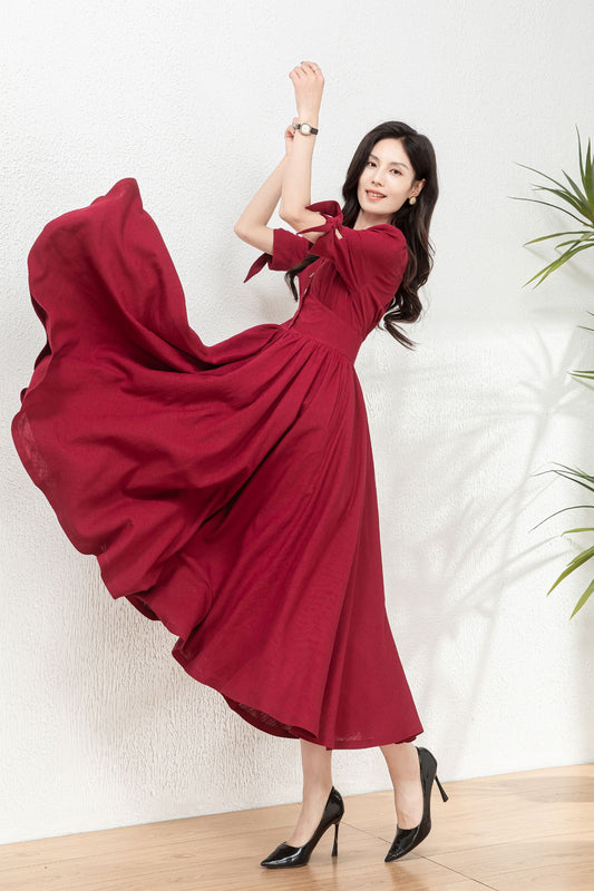 Burgundy fit and flare linen dress C4771