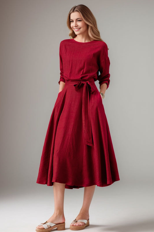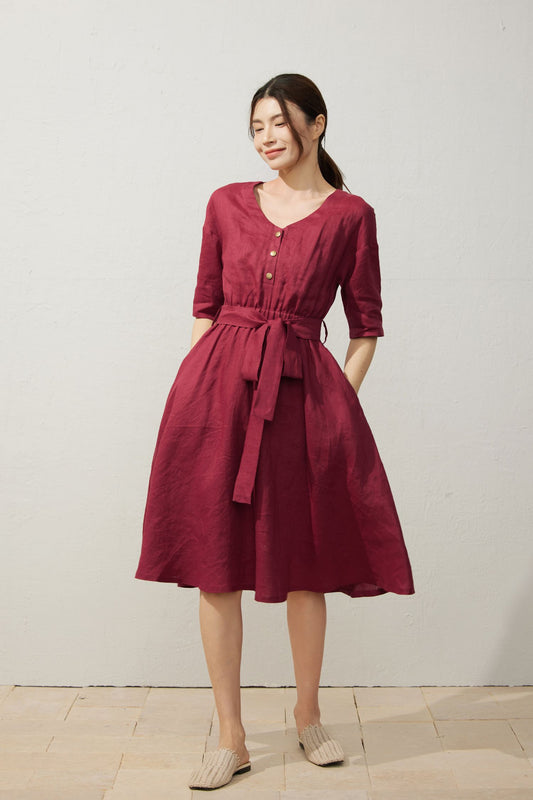 Women's Spring Burgundy Linen belted Dress C3909