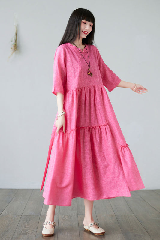 Summer Swing Rose Pink Midi Linen Dress For Women C2281#YY01993