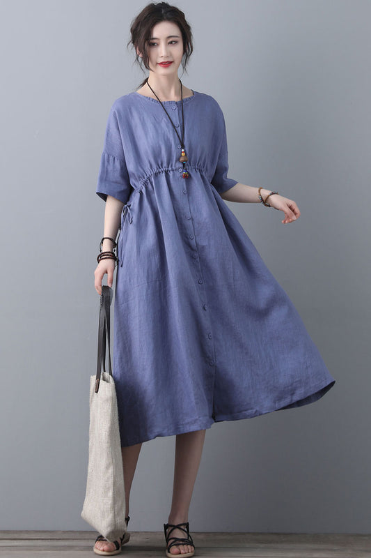 Summer Swing Blue Linen Casual Shirt Dress C1840