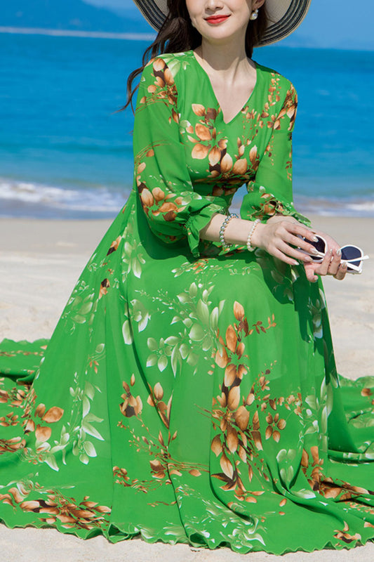 Summer Green Chiffon Long Sleeve Floral Dress C4107