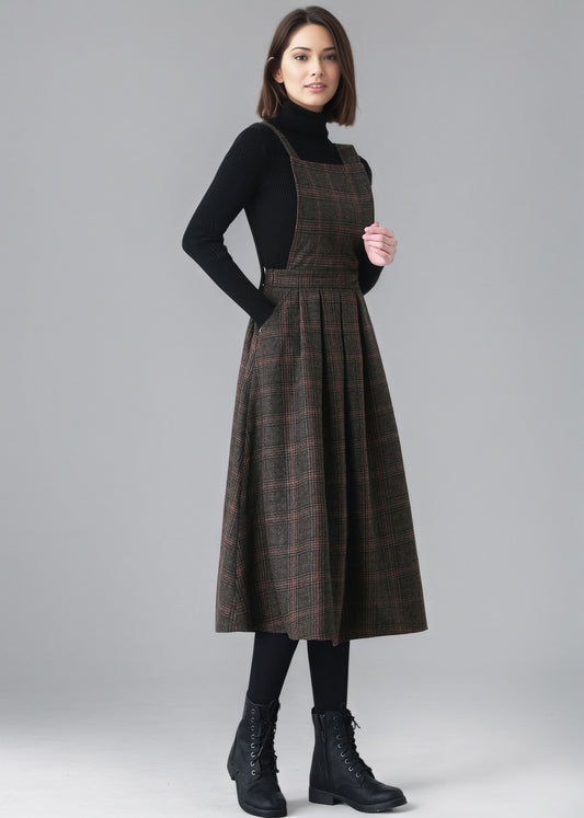 Plaid Wool Pinafore Pleated Dress,Winter Wool dress women C5151
