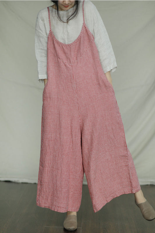 Red Plaid Sleeveless Linen Jumpsuits C2398