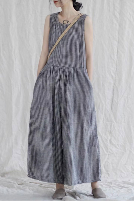 Casual Black Plaid Sleeveless Cotton Linen Jumpsuits C2379