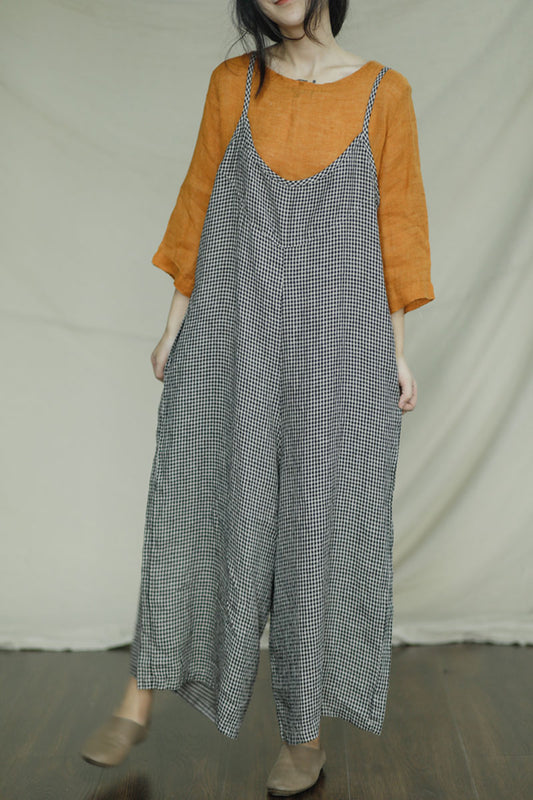Black Plaid Sleeveless Linen Jumpsuits C2398