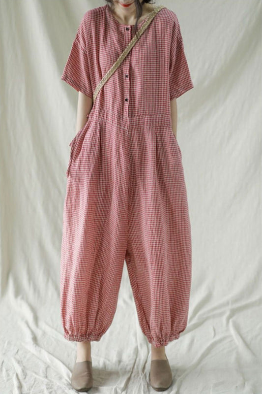 Casual Red Plaid Cotton Linen Jumpsuits C2377