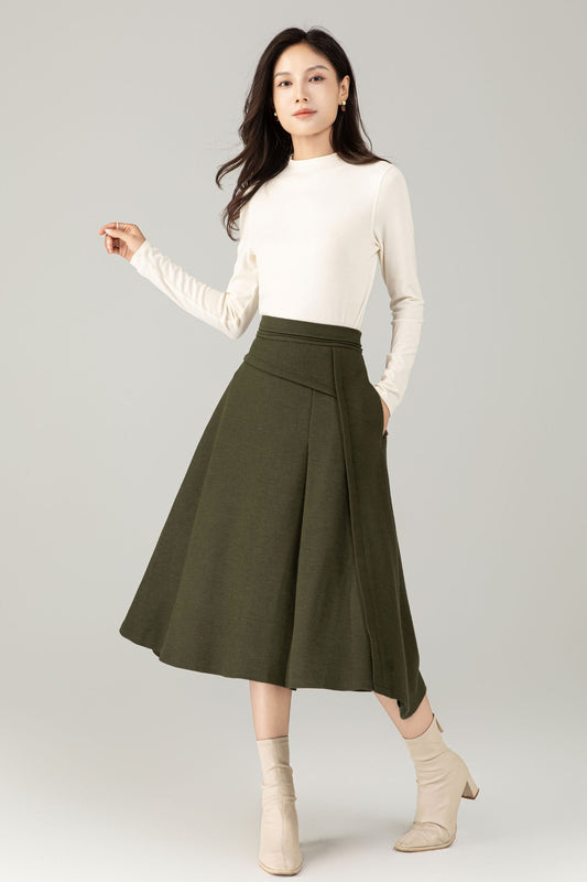 Green Wool Midi Skirt – A-Line Skirt with Pockets C5238