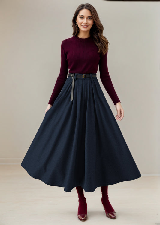 Navy Pleated Long Wool Skirt C5234
