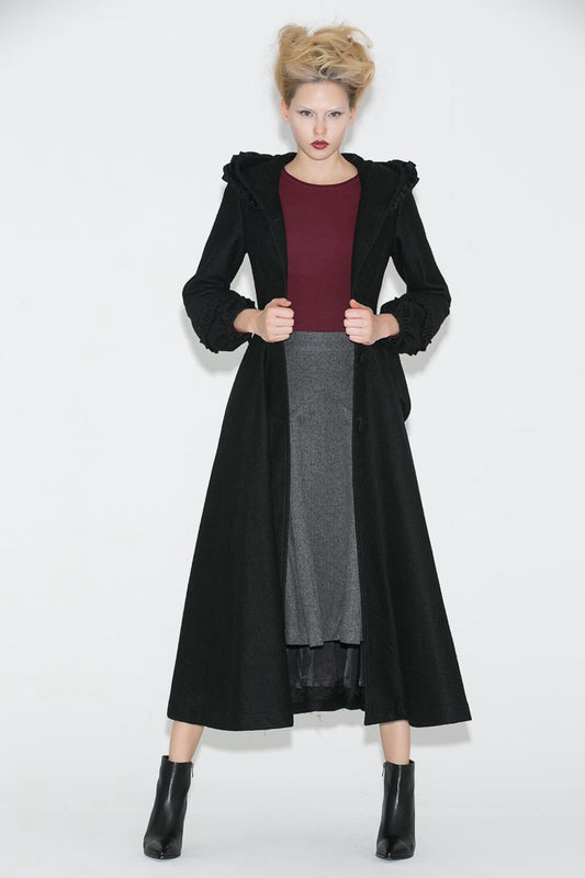 Long black hooded winter wool coat C706