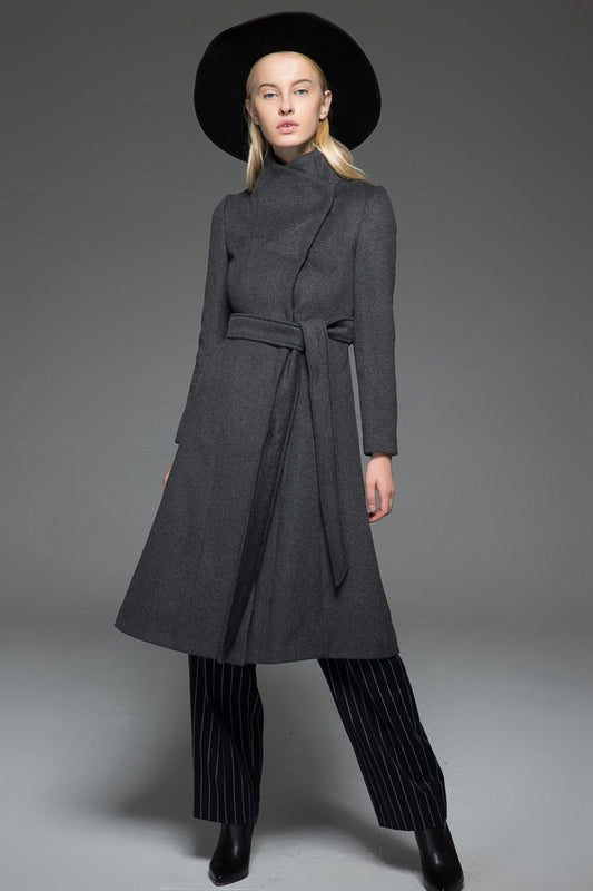 Gray Wool Coat with High Neck Collar C758