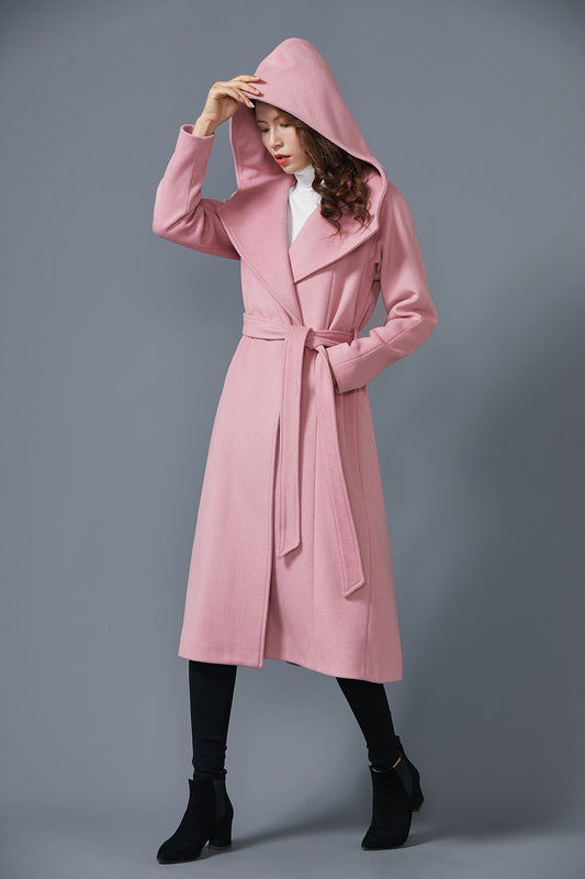 Pink wool hooded long winter coat coat with pockets waist belt handmade coat C1617