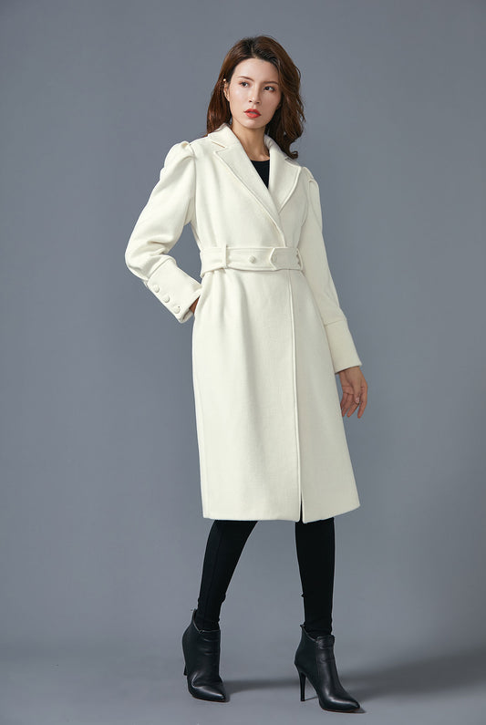 White coat coat with pockets ruffle detail to shoulder waist belt handmade wool coat C1625